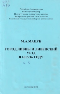 УДК 947 (470.319) “1615/16” М.А.Мацук. Город Ливны и Ливенский уезд в 1615/16 году. Сыктывкар, 2002. Ч.Ш. 129 с. В третьей части опубликована вторая половина текста писцовой дозорной книги Ливенского уезда 1615/16 г. Ответственный редактор доктор исторических наук А. А.Преображенский ©М.А.Мацук ©РГАДА (Приложение № 2)