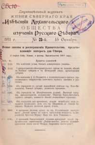 СБсЮ Двухнедельный ждрНадъ ЖИЗНИ СЪВЕРНАГО КРАЯ „ЦзВ^стщя ОБЩЕСТВА Прое •> но " ’ < ' азучещя Руссцаго ^•ЬбераА юТ17. 20-й. 15 Октября. Новые законы и распоряжешя Правительства, представляющее интересъ для Севера. (I отдЪлъ Собр. Узакон. и распор. Правительства 1911 года). Предметы узаконений: Объ изменены устава Омскаго коммерческаго училища. 0 расцространеши л®соохранительнаго закона въ полномъ объем® на Вятскую губернпо и на Шенкурск1й у®здъ, Архангельской губерши. Объ изм®неши § 25 Положешя о вспомогательныхъ кассахъ гор- нозаводскихъ товариществъ казеняыхъ горныхъ заводовъ и руд- никовъ. Объ учреждена въ состав® полицейской команды гор. Ноко-Ни- колаевска, Томской губерши, должности городового. Объ учреждено! на Б®лор®ченскомъ рудник®, Пермской губерши, принадлежащемъ акцюнерному Обществу Верхъ-Исетскихъ горныхъ заводовъ, должности п®шаго полицейскаго стражника. Объ отчуждении или временномъ занятш потребныхъ подъ со- оружеше подъ®здного пути отъ гор. Шадринска до станцш Синарская, Пермской жел®зной дороги, земель. 1620. О присвоенш д®тскому прпоту въ гор. Устьсысольск® наименования: „Д®тсшй пр1ютъ въ память трехсотл®т1я вступлешя на Все- россШскШ Престолъ Первагэ Царя изъ Дома Романовыхъ. 17о. 1625. О присвоенш Рождественской церковно приходской школ® гор. Архангельска наименовашя: „Рождественская женская церковноприходская школа имени Оеодора Андреевича Костогорова“.